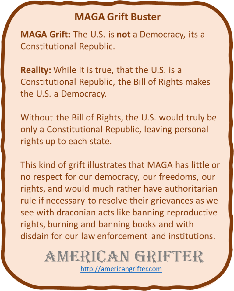 by Jump Back To RealityMore and more MAGA Republicans are discarding democracy; it no longer works for them. MAGA Republicans prefer a Constitutional Republic but stop short of specifying which kind. Russia is a fascist Constitutional … Read more - Trumpy Ratings